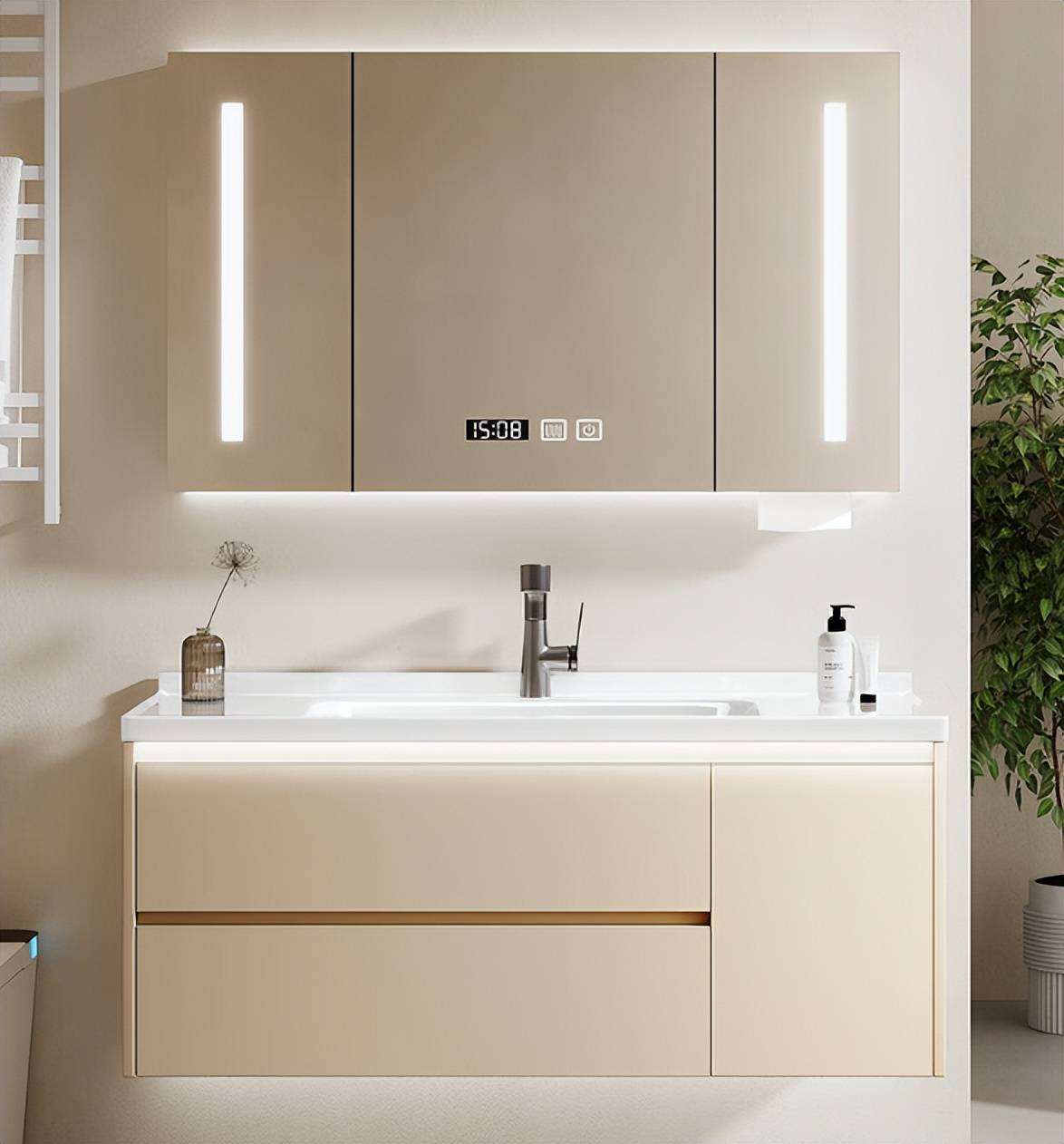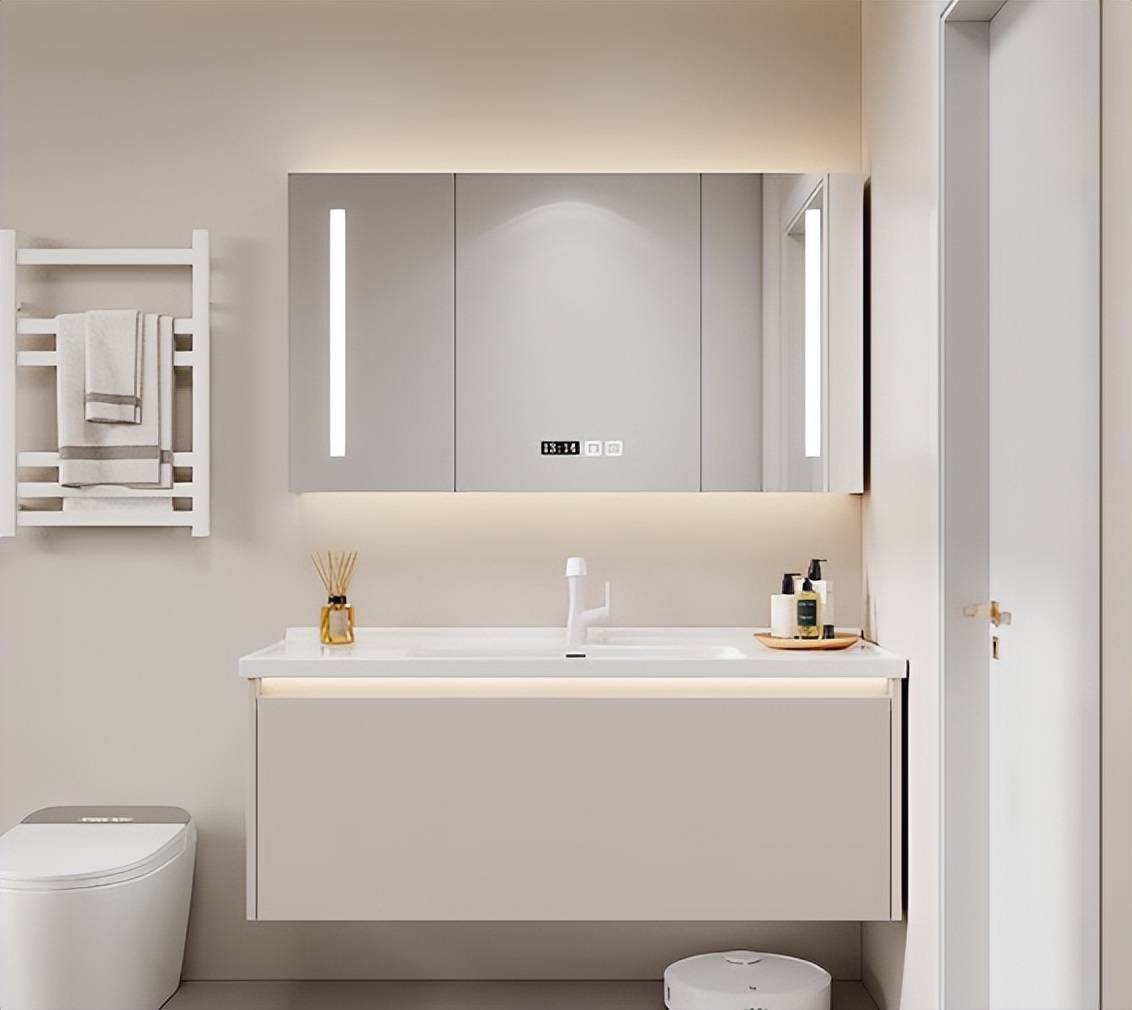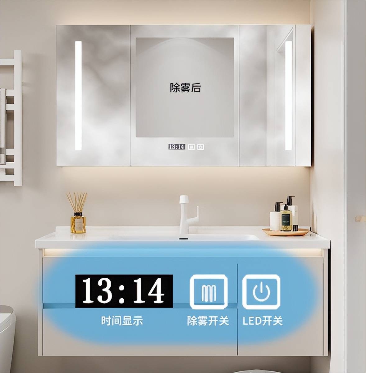9层线层真实桉木制作,耐用度高。EO级国标等级安全:符合EO级国标等级要求,环保健康,这款浴室柜在外观、收纳、照明、防水、除雾、釉面技术等方面都表现出色。它为用户提供了一个既美观又实用的卫浴空间,让日常使用和清洁都变得更加轻松便捷。无论是追求美感还是实用性的用户,都能在这款浴室柜中找到满足自己需求的设计和功能。第五款: