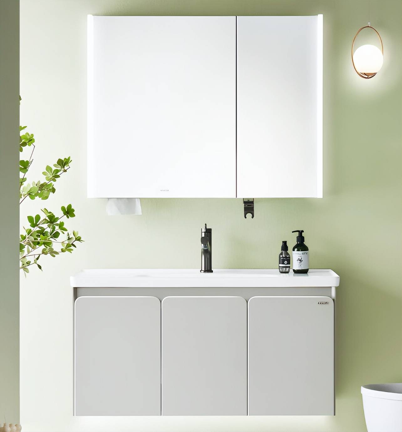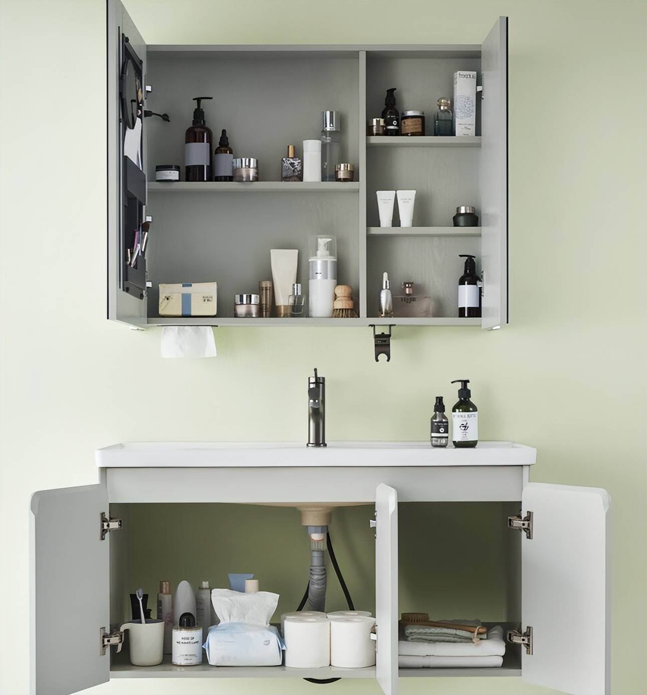 清新治愈的外观:浅灰绿色外观,2.0美妆收纳镜柜:镜柜设计精致到每一个角落,提供了充足的美妆收纳空间。实用便捷的水龙头手机支架:水龙头配备手机支架,实用便捷,提升了使用体验。人性化纸巾口设计:充分利用垂直空间,设计有纸巾口。