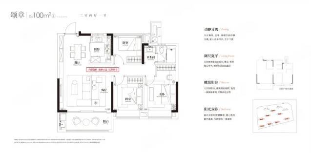 110㎡“三室两厅两卫” 户型在 95㎡户型的基础上,实现了精装配置与智慧功能的全面升级,适合追求品质生活的改善型刚需家庭。户型整体方正通透,全明设计,客厅面宽 4.2 米,与南向 6.2 米长阳台相连,阳台采用全景玻璃护栏,视野开阔,采光充足;阳台预留洗衣机位与智能插座,方便安装智能洗衣机、烘干机等设备。